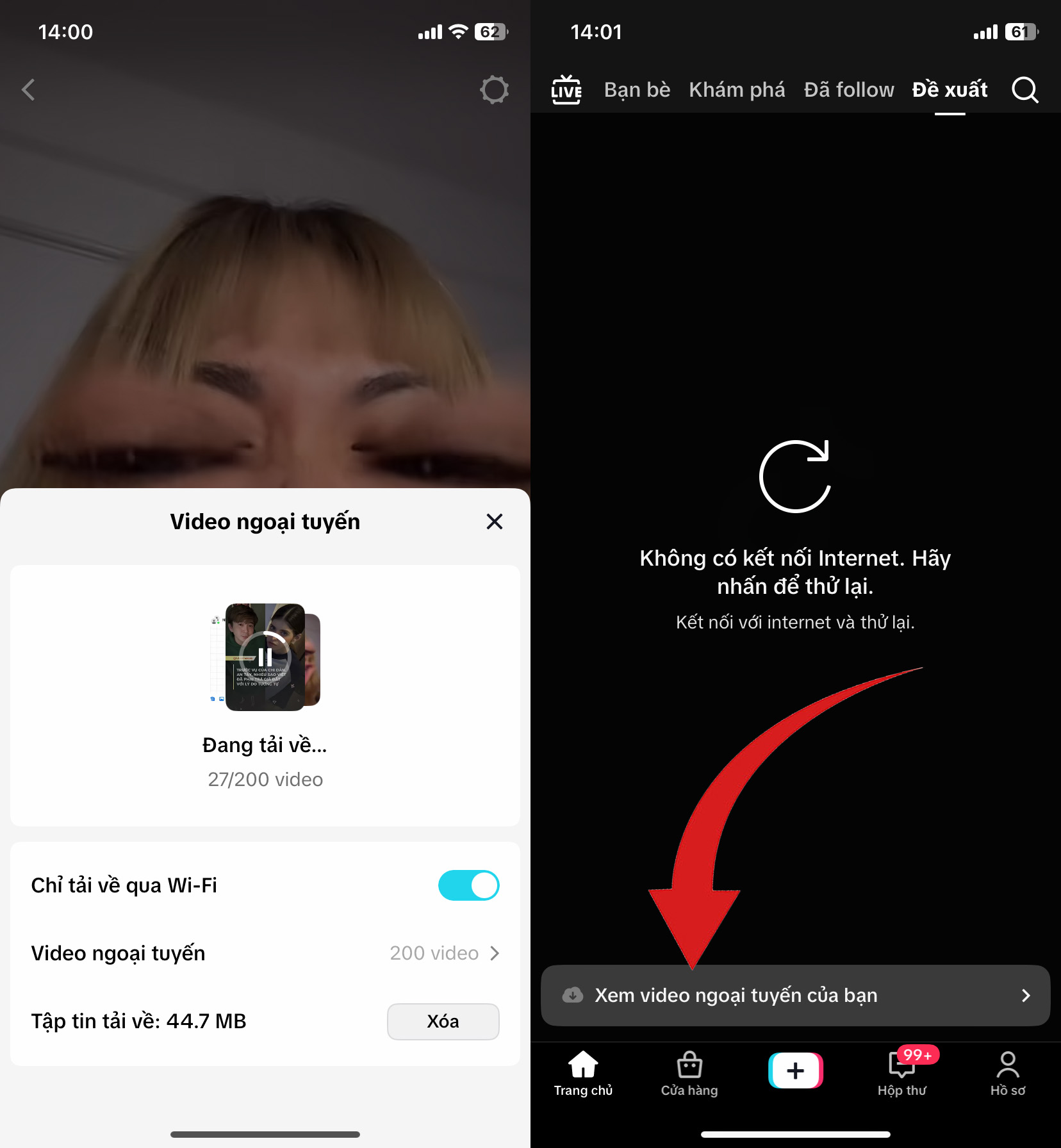 - Ngoài ra, khi TikTok phát hiện người dùng không có kết nối mạng, ứng dụng này sẽ tự gợi ý mục Video ngoại tuyến ở trên thanh tab Trang chủ, Shop, Bạn bè, Hộp thư, v.v.