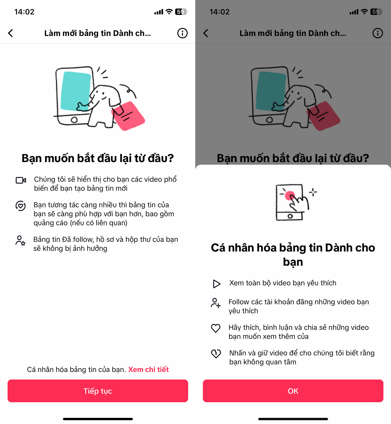 - Bước 4: Tại mục Làm mới bảng tin Dành cho bạn, nhấn Tiếp tục rồi chọn Làm mới.