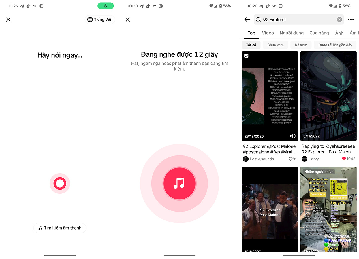 Để sử dụng tính năng tìm bài hát, người dùng có thể nhấn vào biểu tượng micro ở thanh tìm kiếm, sau đó chọn vào phần “Tìm kiếm âm thanh” ở góc dưới cùng. Sau khi nhận diện thành công, ứng dụng sẽ hiển thị danh sách các video phổ biến sử dụng đoạn âm thanh đó.