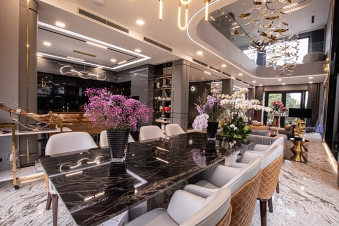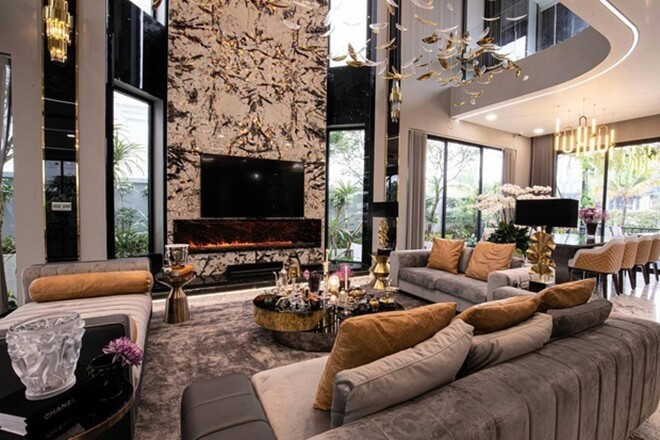 Căn biệt thự của Á hậu Ngô Thùy Linh nổi bật với thiết kế hiện đại, sử dụng nhiều chi tiết ánh kim sang trọng. Phòng khách có trần cao thoáng đãng, với bộ sofa lớn tông màu trung tính được sắp xếp quanh lò sưởi ốp đá vân mây cao cấp.