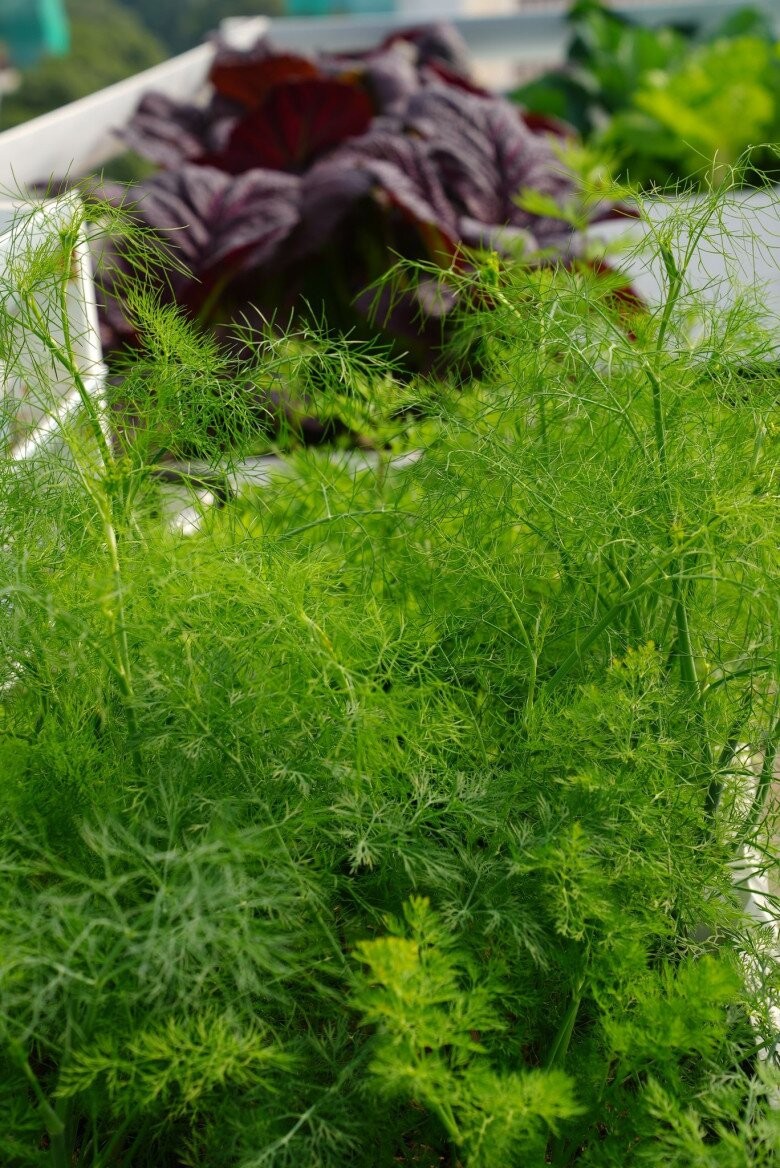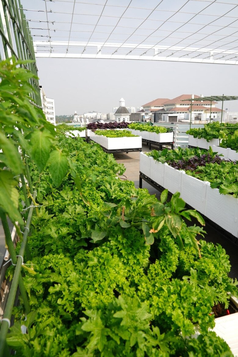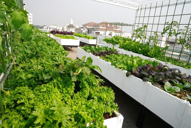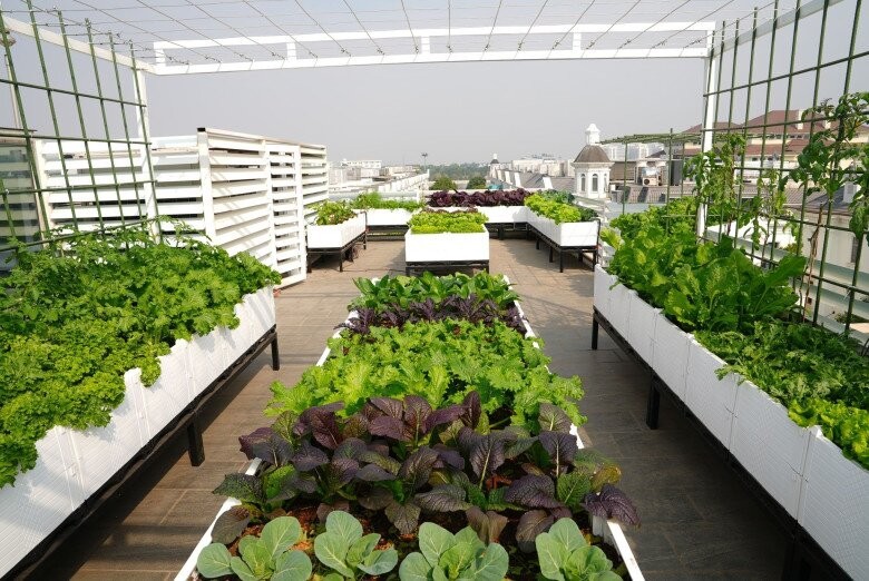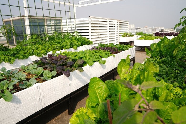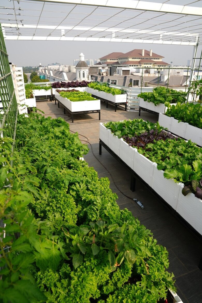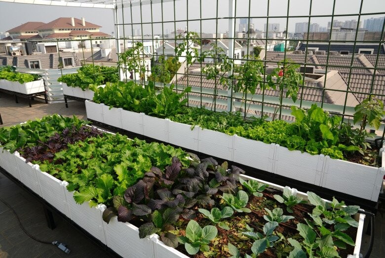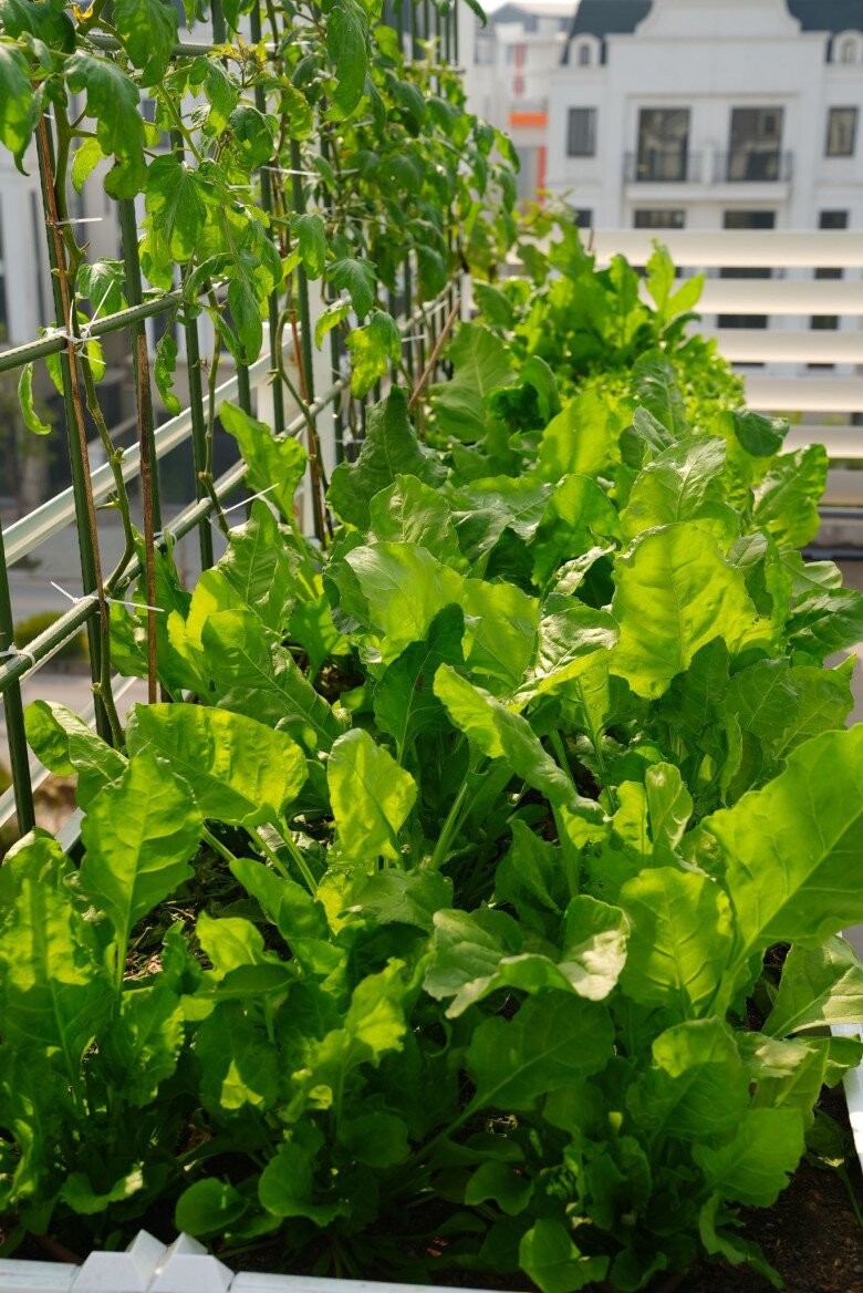 Khu vườn trên cao rộng rãi và được thiết kế chuyên nghiệp. Những luống rau được trồng trong các thùng trắng đồng bộ, bài trí thành hàng ngay ngắn.