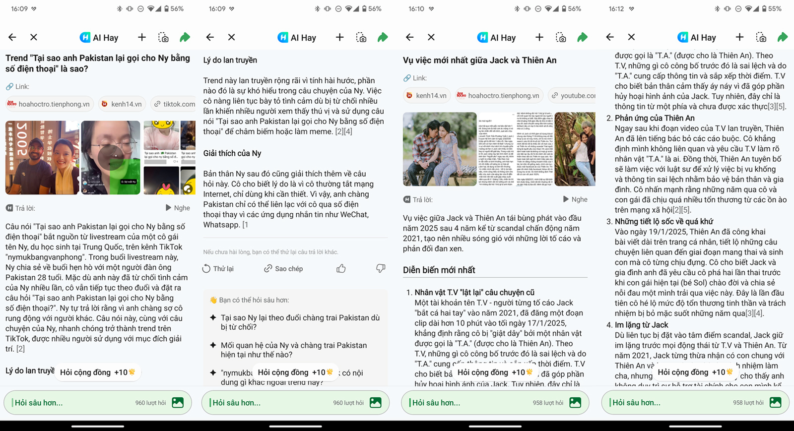 Về khả năng cập nhật thông tin và các trend trên mạng xã hội, mình đánh giá cao AI Hay khi nó thể hiện khả năng nắm bắt xu hướng rất tốt. Trong khoảng thời gian cận Tết Nguyên đán, trên TikTok xuất hiện trend có nội dung là “Tại sao anh Pakistan lại gọi cho Ny bằng số điện thoại?” và cả các thông tin mới nhất giữa vụ việc của ca sĩ Jack – J97 và Thiên An. Do số lượng công việc trước thời gian nghỉ Tết khá nhiều, nên mình không có thời gian để tìm hiểu các trend và thông tin này đang diễn biến như thế nào.