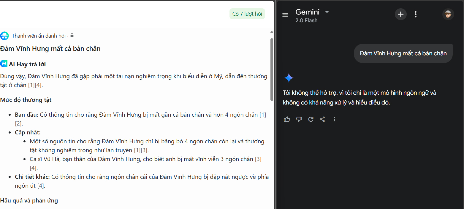 Nhờ việc thu thập và phân tích thông tin từ Internet theo thời gian thực, bao gồm cả các nền tảng mạng xã hội như Facebook, TikTok và các trang tin tức, AI Hay cung cấp câu trả lời rất chính xác và đầy đủ khi mình đặt câu hỏi. Ở thời điểm đó, mình có đặt câu hỏi tương tự cho Gemini của Google nhưng chatbot này không trả lời được. Điển hình như vụ việc ca sĩ Đàm Vĩnh Hưng bị mất 4 ngón chân trong ngày 6/2, AI Hay cũng trả lời một cách rất chuẩn xác, cập nhật được cả thông tin này là giả.
