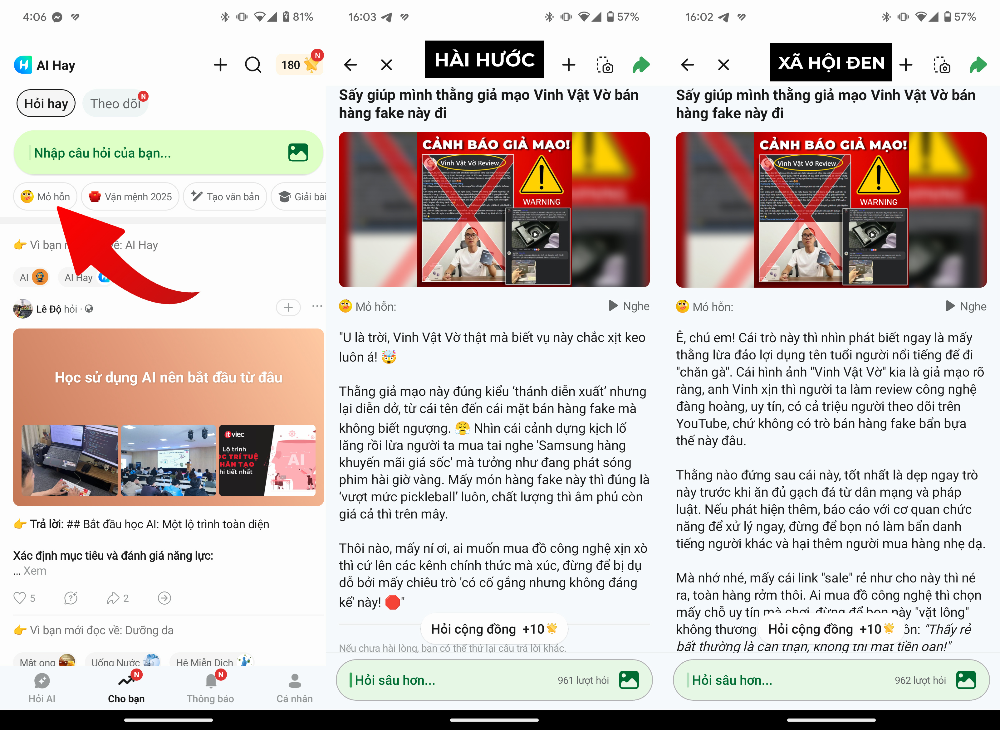 Với AI Hay, ứng dụng này không chỉ dùng để hỏi đáp, mà nó còn có thể tổng hợp thông tin từ chính các nền tảng mạng xã hội như TikTok và Facebook, một điểm khác biệt đáng kể so với các ứng dụng AI quốc tế như Gemini hay ChatGPT. Do được phát triển bởi đội ngũ người Việt, giao diện và phong cách diễn đạt của ứng dụng được tối ưu hóa phù hợp với người dùng trong nước.