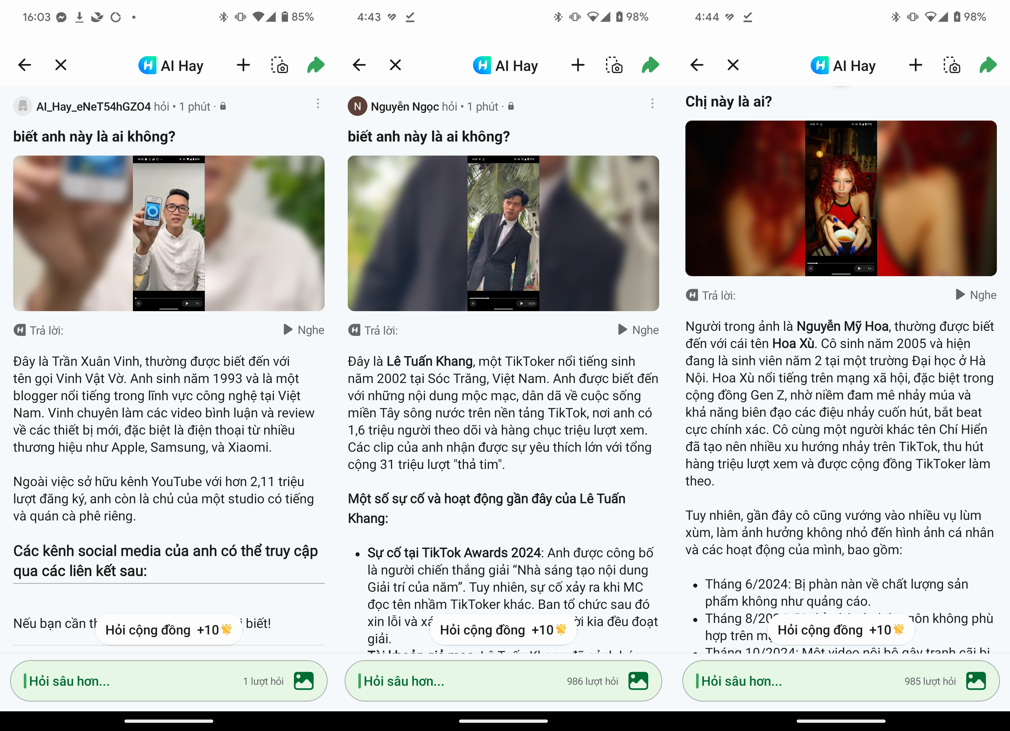 Mình cũng có thử khả năng nhận dạng ảnh của AI Hay khi nhấn tải ảnh chụp màn hình lên ứng dụng này để hỏi. Nhìn chung, AI Hay cho khả năng nhận dạng tương đối chính xác về tên KOC/KOL nổi tiếng. Tuy nhiên một vài thông tin hay hỏi các sản phẩm như điện thoại hay Laptop thì thông tin mà ứng dụng này đưa ra vẫn còn nhiều sai xót.