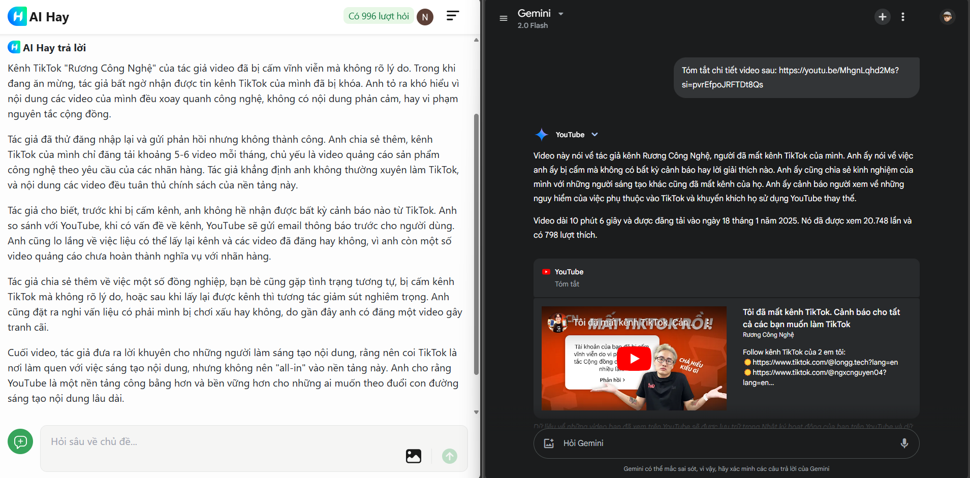 Qua trải nghiệm thực tế, tính năng tóm tắt video của AI Hay tỏ ra vượt trội so với một số đối thủ. Ví dụ, khi tóm tắt cùng một video trên kênh “Rương Công nghệ”, AI Hay trả về kết quả chi tiết và đầy đủ thông tin, trong khi Gemini 2.0 Flash chỉ tóm tắt rất ngắn gọn và kèm theo đường link YouTube, khiến mình khó nắm bắt được nội dung chính. Tất nhiên, với những video hướng dẫn hoặc có nội dung kiến thức chuyên môn quan trọng, các bạn vẫn nên dành thời gian xem đầy đủ để hiểu rõ chi tiết.