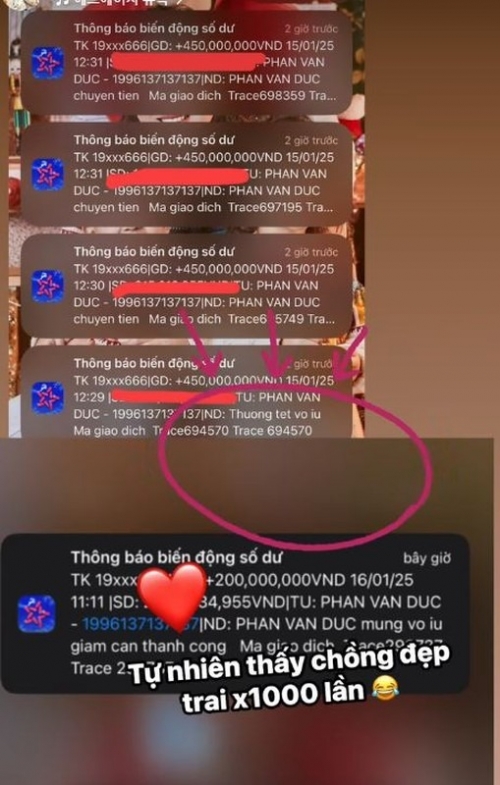 Sau đó một ngày, Văn Đức lại tiếp tục chuyển thêm cho vợ 200 triệu đồng vì nàng WAG giảm cân thành công. |