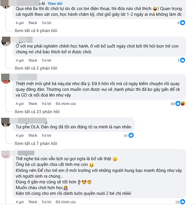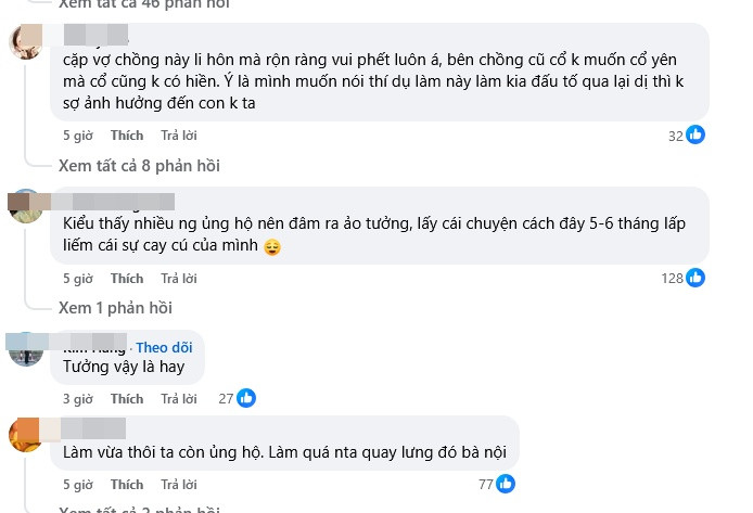 Dưới bài đăng, bên cạnh loạt ý kiến trái chiều thì cũng có một số người để lại bình luận: “Thiệt mệt mỏi ghê. Đã ly hôn rồi mà cả ngày kiếm chuyện rồi quay quay đăng đàn”, “Quá ngán ngẩm vì cách hành xử của hai con người này. Từ lúc ly hôn đến giờ là nhiều năm trôi qua rồi mà lần nào cũng ồn ào, lùm xùm”, “Thương nhất là hai bé. Người lớn đấu tố nhưng tổn thương lại là hai đứa nhỏ”…