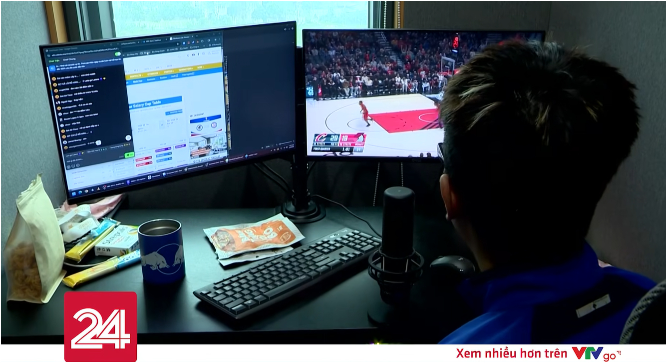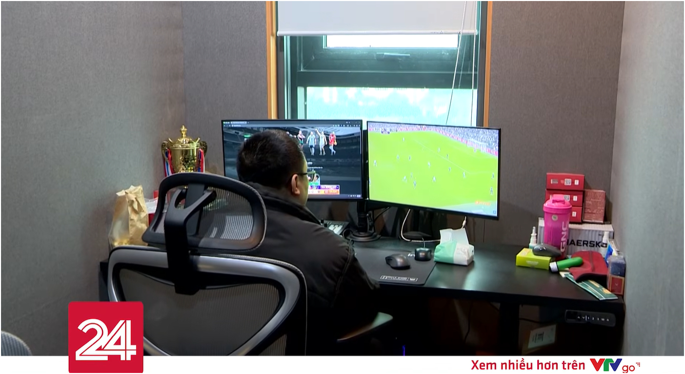 Hình ảnh bên trong cabin – hay còn được gọi là phòng thu của các BLV Xôi Lạc TV, clip do VTV24 ghi nhận. Ảnh chụp màn hình.
