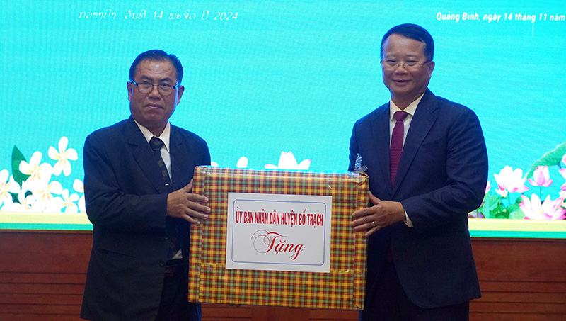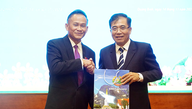 (QBĐT) – Chiều 14/11, tại TP. Đồng Hới, đoàn đại biểu biên giới hai tỉnh Quảng Bình và Khăm Muồn (Lào) tổ chức hội đàm, ký kết biên bản hợp tác. Đoàn đại biểu tỉnh Quảng Bình do đồng chí Đoàn Ngọc Lâm, Ủy viên Ban Thường vụ Tỉnh ủy, Phó Chủ tịch Thường trực UBND tỉnh làm trưởng đoàn. Đoàn đại biểu tỉnh Khăm Muồn do đồng chí Kẹo-ủ-đon Bút-sing-khỏn, Ủy viên Ban Thường vụ Tỉnh ủy, Phó tỉnh trưởng làm trưởng đoàn.
