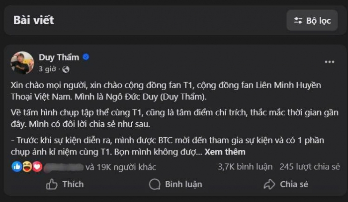 “Cá nhân mình cũng rất thắc mắc sao mình được chụp mà những người đóng góp cho cộng đồng LMHT lại không và mình cũng chỉ biết chuyện này cũng như những bất cập của ban tổ chức sau khi sự kiện kết thúc”, Duy Thẩm giải thích thêm.