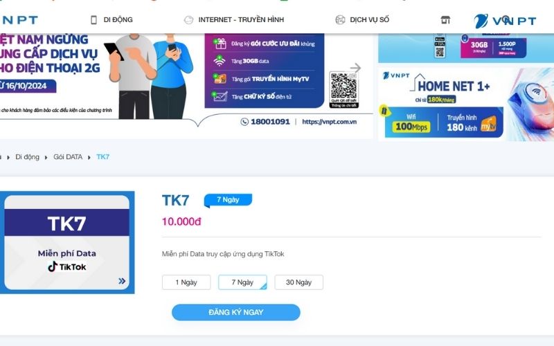 Bước 2: Truy cập trang thông tin gói TK7, xem kỹ các thông tin chi tiết và nhấn “Đăng ký ngay“.