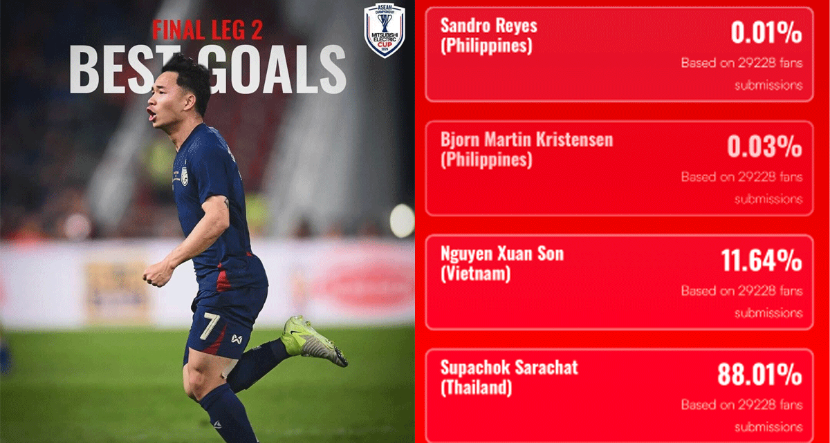 Mới đây, sau hai ngày bình chọn online trên trang ASEAN United FC, danh hiệu Bàn thắng đẹp nhất trận chung kết lượt về ASEAN Cup 2024 đã thuộc về tiền vệ Supachok Sarachat với với 85,41% trong tổng số 46.482 lượt bầu chọn. Xếp vị trí thứ 2 là Nguyễn Hai Long với 12,12%. Tiếp theo là Tuấn Hải (2,22%) và cuối cùng Ben Davis (0,25%).