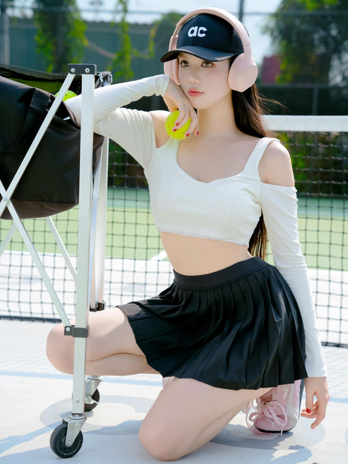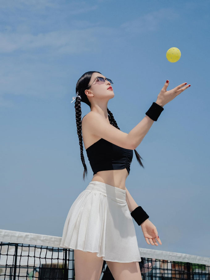 Cô nàng rạng rỡ từ 6h sáng, tóc cột cao, trang phục crop top kèm chân váy thể thao ton-sur-ton, toát lên thần thái như chụp hình thời trang chứ không chỉ đơn thuần là ra sân chơi pickleball.