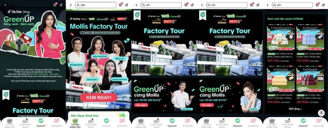 Sáng kiến GreenUP do TikTok Shop khởi xướng hướng đến giới thiệu các sản phẩm xanh, bền vững, thân thiện môi trường, qua đó khuyến khích thói quen tiêu dùng có trách nhiệm và bền vững trong cộng đồng. Nằm trong khuôn khổ chiến dịch, vừa qua, hoạt động tham quan nhà máy của Mollis – thương hiệu sản xuất khăn bông hàng đầu Việt Nam đã hé mở những góc nhìn chân thực quy trình sản xuất hiện đại, đáp ứng các tiêu chuẩn nghiêm ngặt về bảo vệ môi trường trong hoạt động kinh doanh của Mollis. Tham gia hoạt động tham quan nhà máy còn có sự góp mặt của các nhà sáng tạo nội dung như @hennieofficial, @realpewpew, @diep.lez,.. nhằm gia tăng hiệu quả kết nối và tương tác với cộng đồng người tiêu dùng, từ đó giúp thương hiệu xây dựng lòng tin, sự trung thành và tệp khách hàng mục tiêu.