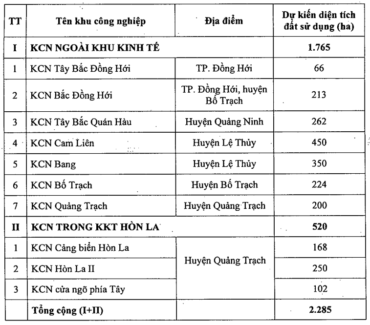 Theo phê duyệt quy hoạch tỉnh Quảng Bình, đến năm 2030 tỉnh sẽ có 10 khu công nghiệp với tổng diện tích khoảng 2,285ha.
