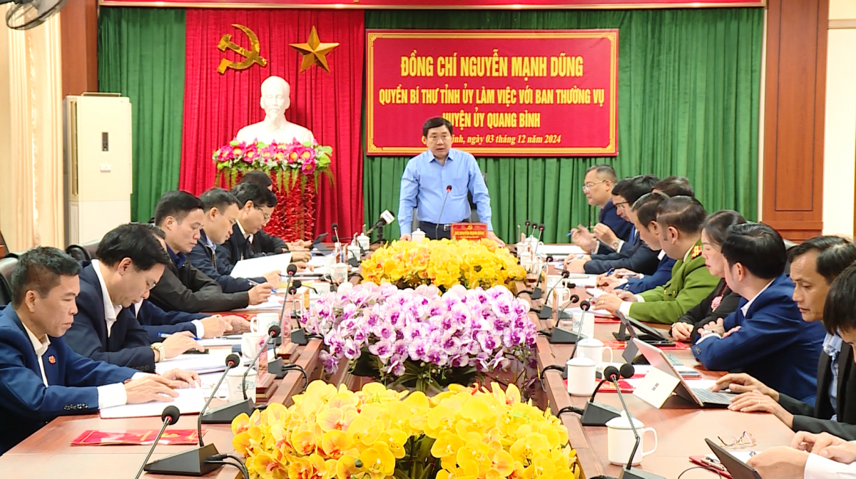 Ngày 3/12, đồng chí Nguyễn Mạnh Dũng, Quyền Bí thư Tỉnh ủy đã có buổi làm việc với Ban Thường vụ Huyện ủy Quang Bình nhằm nắm bắt kết quả công tác xây dựng Đảng, hệ thống chính trị; công tác chuẩn bị các mặt cho đại hội Đảng các cấp; các giải pháp đẩy nhanh giải ngân các nguồn vốn đầu tư và tình hình thực hiện xóa nhà tạm, nhà dột nát cho người có công, hộ nghèo, cận nghèo trên địa bàn. Cùng tham gia buổi làm việc có đồng chí Nguyễn Minh Tiến, Ủy viên Ban Thường vụ Tỉnh ủy, Trưởng Ban Tổ chức Tỉnh ủy; đồng chí Trần Quang Minh, Ủy viên Ban Thường vụ Tỉnh ủy, Chủ nhiệm Ủy ban Kiểm tra Tỉnh ủy; đồng chí Lý Thị Lan, Ủy viên Ban Thường vụ Tỉnh ủy, Trưởng Đoàn đại biểu Quốc hội khóa XV tỉnh Hà Giang.