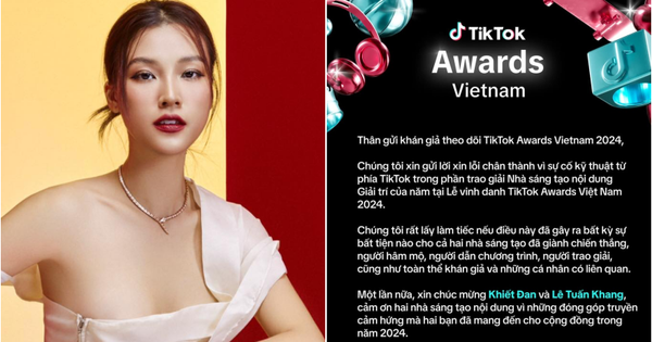 Chiều tối 24/11, gần 1 ngày sau khi sự việc xảy ra, fanpage chính thức của TikTok tại Việt Nam mới chính thức lên tiếng. Cụ thể, BTC TikTok Awards Việt Nam 2024 gửi lời xin lỗi chân thành vì sự cố kỹ thuật từ phía TikTok, đồng thời gửi lời chúc mừng đến 2 nhà sáng tạo Khiết Đan và Lê Tuấn Khang.