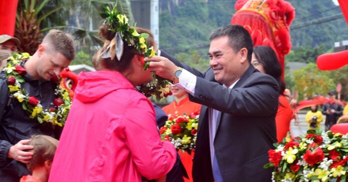 Ông Nguyễn Ngọc Quý, Giám đốc Sở Du lịch tỉnh Quảng Bình, chào đón du khách quốc tế đến Phong Nha – Kẻ Bàng dịp đầu năm 2024