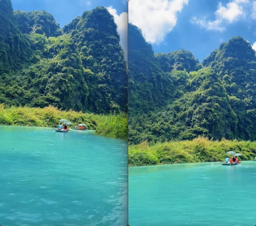 Khác với khung cảnh thường thấy tại Tràng An, nơi mặt nước phẳng lặng, trong veo đến mức có thể nhìn rõ từng nhành rong rêu dưới đáy, từng chiếc lá rơi nhẹ trên mặt nước, đoạn video cho thấy một Tràng An mới lạ với gam màu xanh ngọc đặc biệt, phản chiếu ánh sáng như thủy tinh. Nước không chỉ trong mà còn mang sắc xanh sâu hút như ngọc lục bảo, khiến cảnh vật xung quanh càng trở nên nổi bật và mơ màng hơn bao giờ hết.