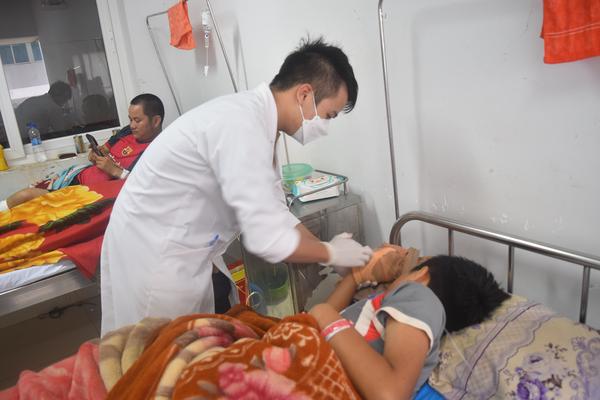 Bác sĩ đang thăm khám cho một học sinh bị pháo nổ gây đa chấn thương. Ảnh: ND