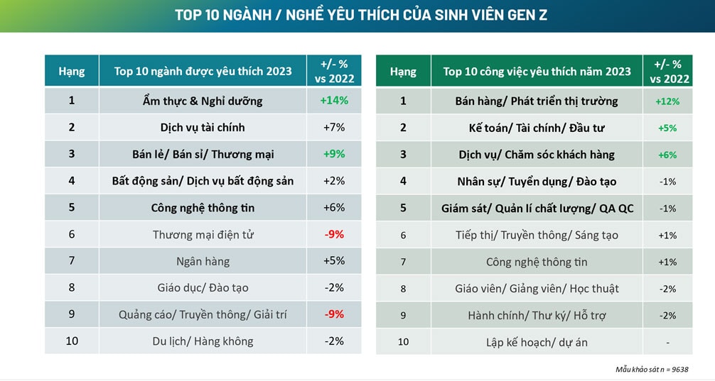 Về xu hướng lựa chọn nghề, khảo sát Xu hướng Sinh viên của Anphabe vào giữa và cuối năm 2023 với 9.638 sinh viên về TOP 10 ngành/nghề yêu thích của sinh viên Gen Z cho thấy: Đối với sinh viên Gen Z, Ẩm thực & nghỉ dưỡng; Dịch vụ tài chính và Bán lẻ/bán sỉ/thương mại là những ngành được yêu thích nhất. Các ngành này cũng là những ngành ghi nhận sự gia tăng yêu thích từ phía Gen Z.